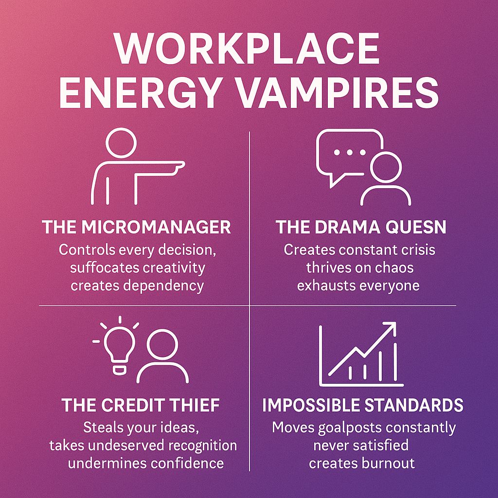 We recently shared a graphic on our social media that breaks down the four most common types of workplace energy vampires. Now, let's take a deeper dive into each one and, most importantly, how you can protect your energy and sanity when you're dealing with them.